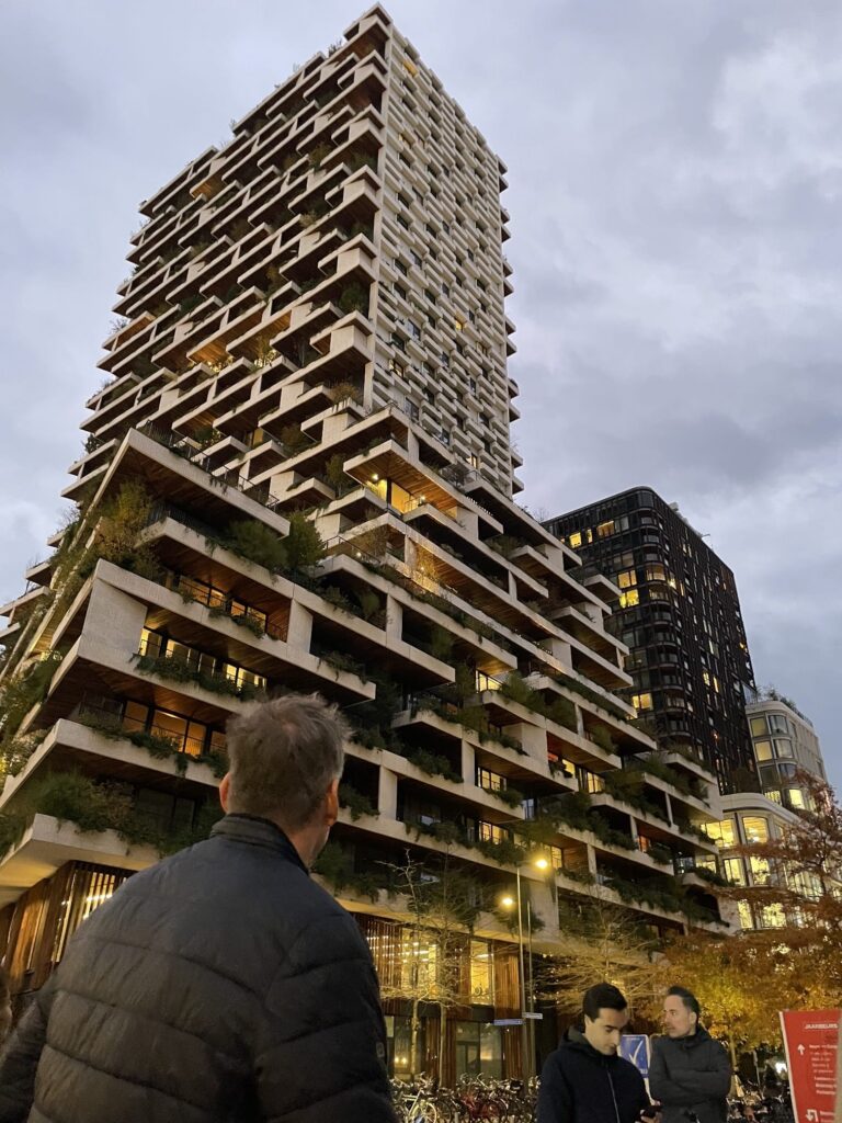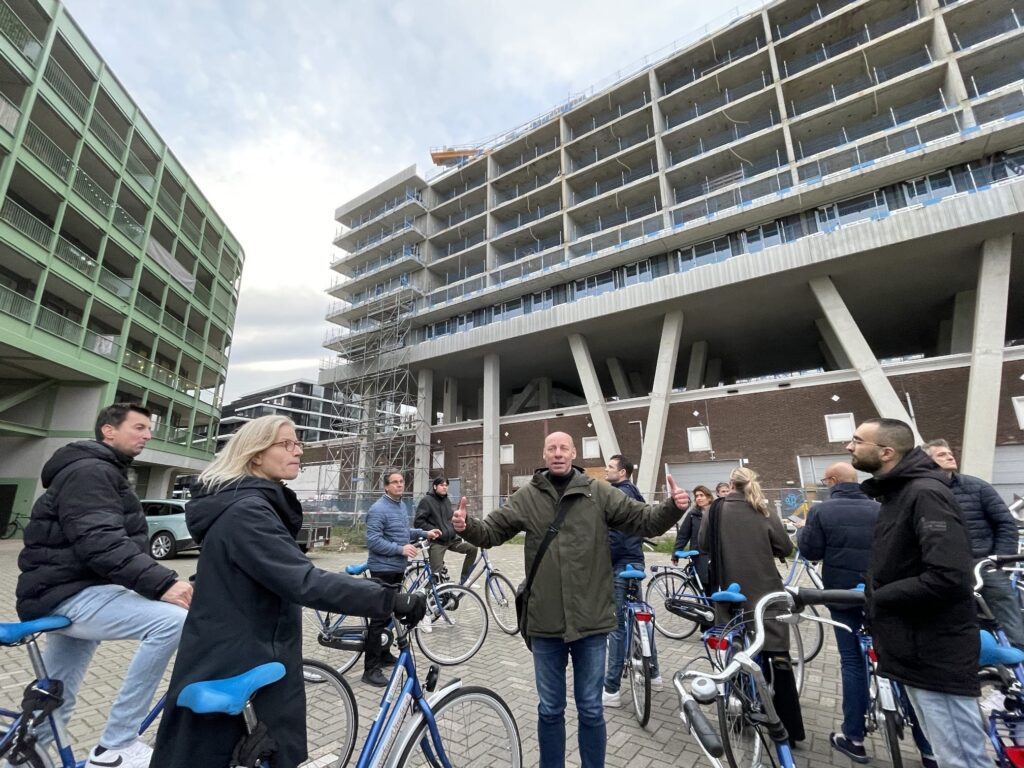 Op de fiets nam Paul Splinter de deelnemers – een mix van professionals werkzaam bij ontwikkelaars, woningcorporaties en gemeenten – mee naar diverse ontwikkelingen aan de westkant van de stad. Zo wierpen we een blik op de spoorzone ontwikkelingen in Wisselspoor en Cartesius, de Merwedekanaalzone met De Nieuwe Defensie en het Beurskwartier. Ook ging de route door Leidsche Rijn Centrum en Leeuwesteyn, waardoor de deelnemers, fietsend over de Daphne Schippersbrug, ervaarden hoe Leidsche Rijn steeds verder toe groeit naar de ‘stad’.